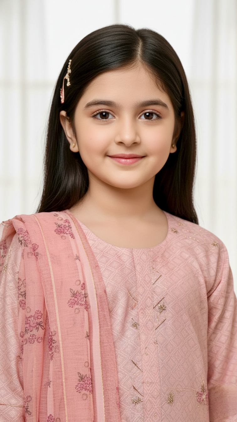 Introducing our 3 Piece Winter Cotton Jacquard Suit! This beautiful suit features a stitched A line frock with a delicate chicken embroidery, paired with a trouser and a digital print duppata. Made with comfortable cotton jacquard fabric, this suit will keep your baby girl warm and stylish this winter.