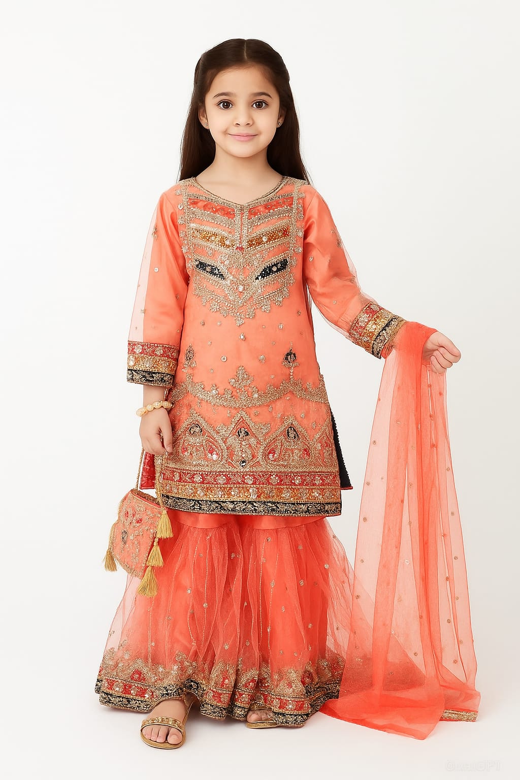 4 piece Satin Silk, kasab Net Embroidery Gharara Suit With Pouch.