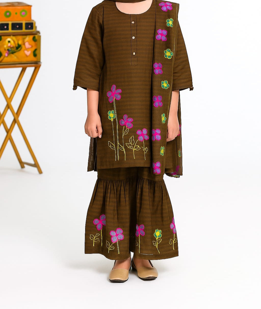 This 3 piece gharara suit features a stylish digital print duppata and intricate embroidery on the shirt and gharara. Made from high-quality cotton lawn, it offers ultimate comfort and elegance for any baby girl. Perfect for any special occasion, this pret collection is a must-have for your little one's wardrobe.